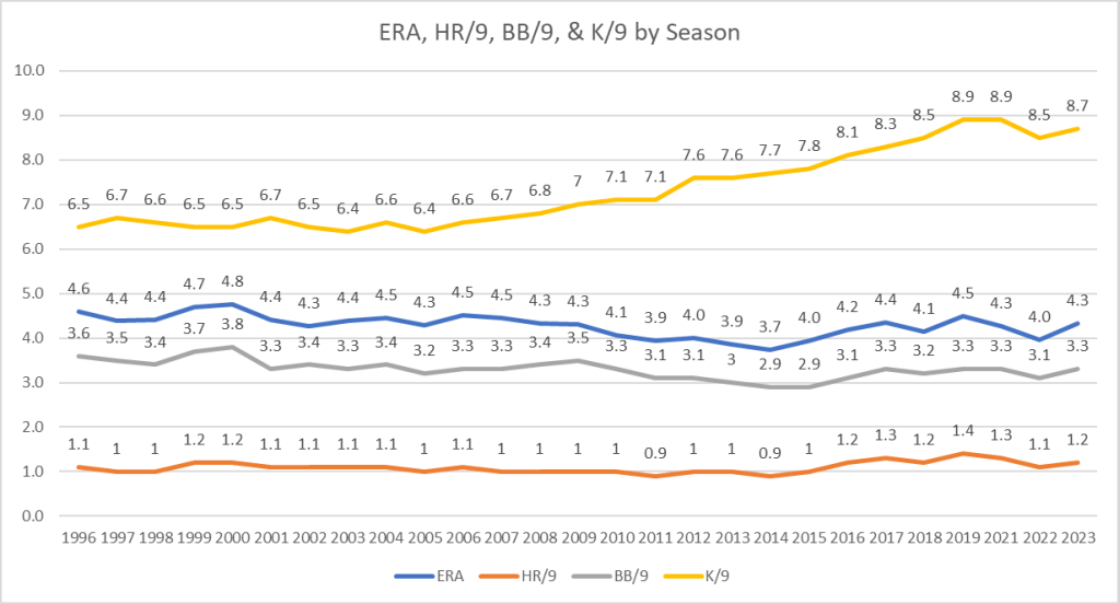 During the Steroid Era, pitcher ERA was higher, but HR/9 and BB/9 remained relatively consistent even through 2023, the most staggering trend is K/9 increasing from 6.5 K/9 in 1996 to 8.7 in 2023. This could simply explain why pitchers aren’t pitching deeper into games in recent years. It takes at least 3 pitches to strikeout a batter, but only 1 for them to get out via a batted ball.