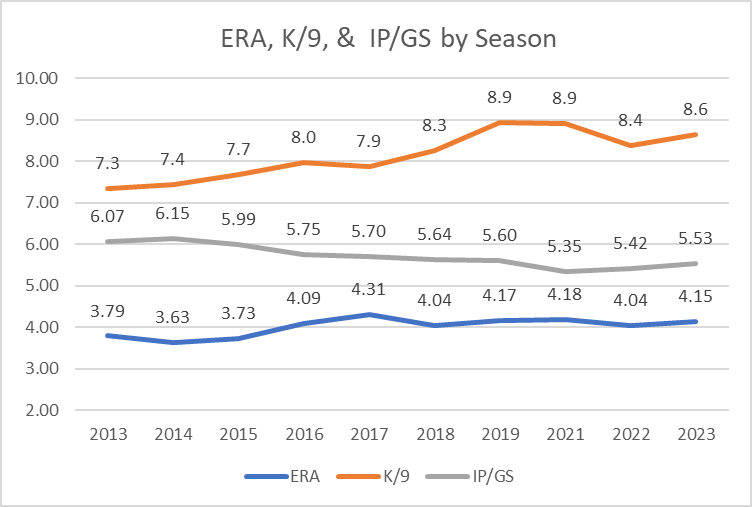Over the past 10 seasons (excluding shortened 2020 season), there has been a clear trend among starting pitchers. ERA has risen from consistently being below 3.79 in 2013 to being north of 4.00 with a 4.15 ERA in 2023. Pitchers are also not pitching past the 6th inning with an average length of a start of 6.07 IP in 2013 to just 5.5 IP/GS in 2023. Those two metrics may be correlated, given that a pitcher doesn’t have the opportunity to get more outs and perhaps lower his ERA, but both may be related to K/9.