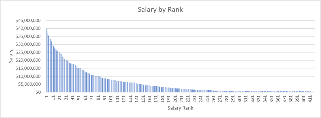 Of the 655 players to have at least 1 plate appearance in 2023, there are 419 with salary information available to public and they earned a total of $2.47B, with Aaron Judge being the highest paid player at $40.0M (1.6% of league total). ~80% of that total salary is allocated to 31.5% of the player pool. Those same 419 players generated a total WAR of 542.1 and ~80% was attributed to 26.5% of the player pool. This suggests that some players may be overpaid given their production, or high paid players had shortened seasons due to injury, but the gap between WAR and salary is only 5% also implying distribution of salary is relatively efficient.