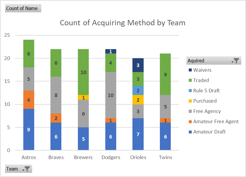 Below is how each of the six division winners constructed their rosters. This view only looks at the players that made the greatest contributions, in terms of games played. The Dodgers & Braves we’re able to acquire more players through free agency given their bigger budgets, but the Brewers & Twins had to get creative through trades. Meanwhile the Orioles & Astros relied on their development and scouting to source players internally.