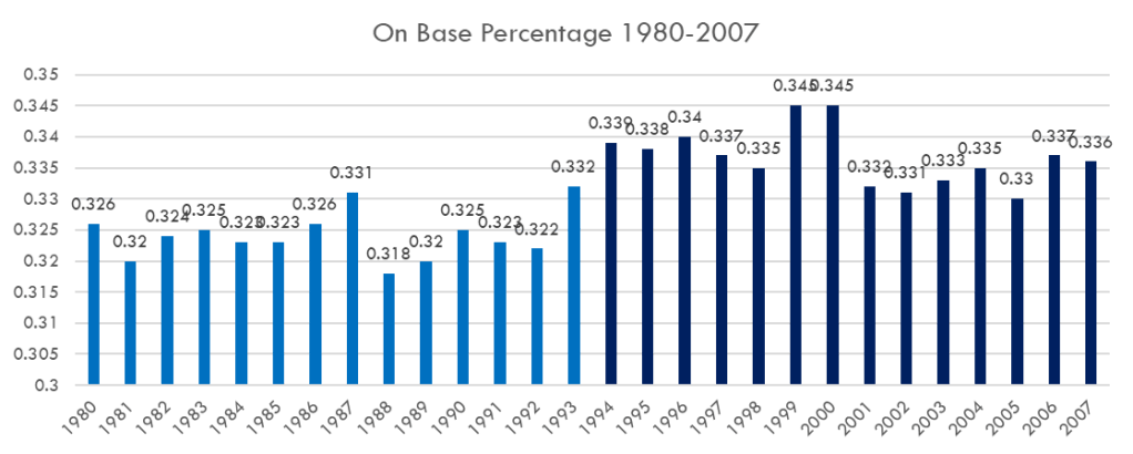 Comparing the periods of 1980-1993 and 1994-2007, OBP increased from 0.324 to 0.337, with a distinct difference over each 14 year period. Not only was OBP effected by the use of steroids, but increases in ERA, batting average, and slugging percentage can be observed. This 0.013 increase in OBP is statistically significant at 95% confidence interval.