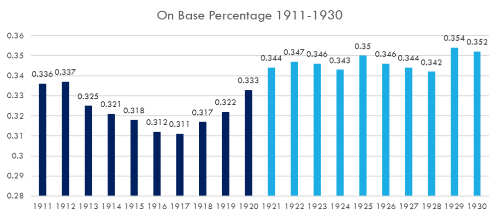 There have been four distinct moments in Major League Baseball history that have led to the largest statistically significant shifts in on-base percentage. These are: 1921, 1942, 1969, & 1994.