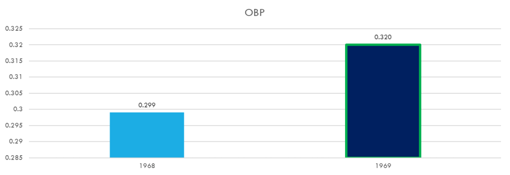 Major League Baseball accomplished what it set out to do in 1969. By lowering the mound by 5 inches from 15 inches to 10 inches, pitching had less of an advantage, and on base percentage increased from 0.299 to 0.320. This change is statistically significant at 95% confidence interval.